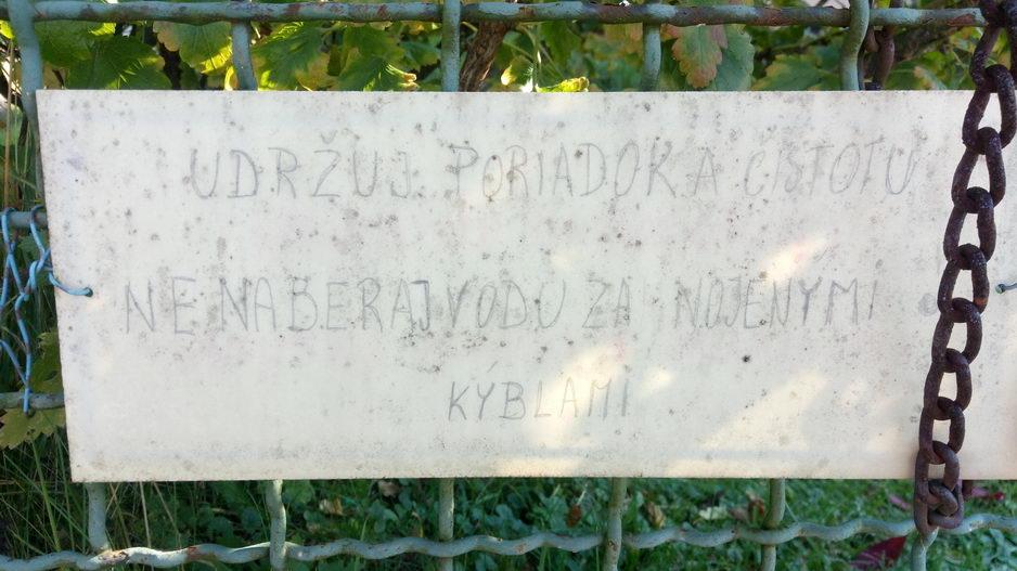 Prameň v zastavanej časti obce. Zachytený cez plastovú rúru do plastovej nádoby na ulici. Prikrytá bola plastovým vekom ktoré sa dalo otvoriť. Voda bola číra, bez zápachu a sedimentov. Prameň silno neodporúčame na pitie. Pri múriku je nedávno osadený kameň s vytesaným dátumom 1955 - 2015 a vytesaným slovenským znakom. V okolí prameňa boli rôzne kefky čo naznačuje, že prameň je využívaný na čistenie a umývanie (pranie)... Kuriozitou je nápis na plote nad prameňom s textom: