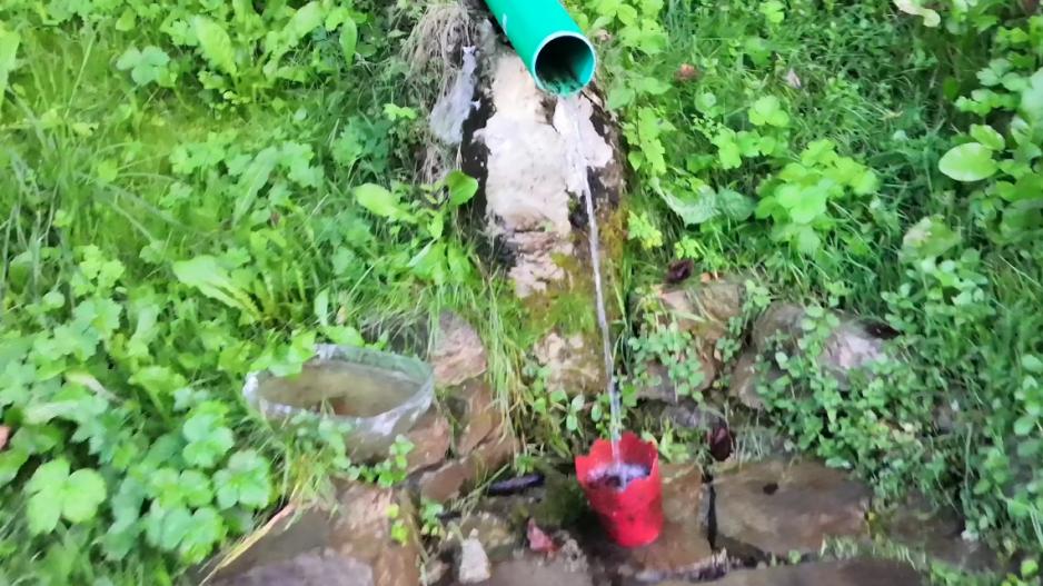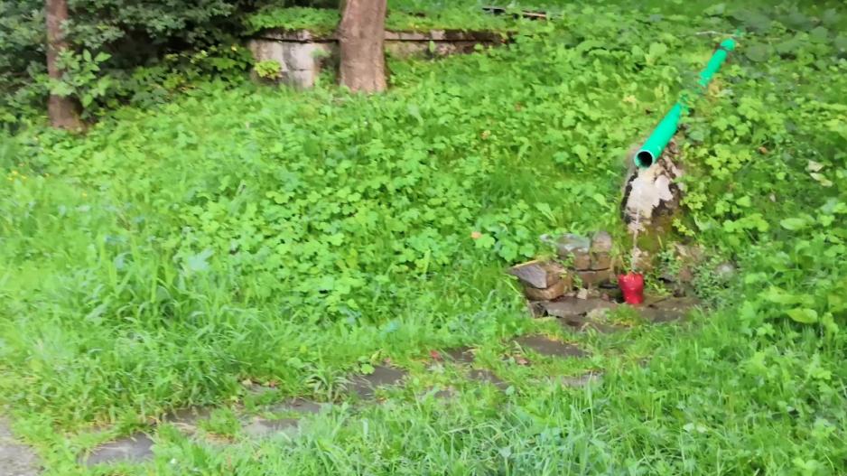 Pri zastávke MHD na Medzihradnom vyteká z dlhej rúry voda z vyššie položeného prameňa.